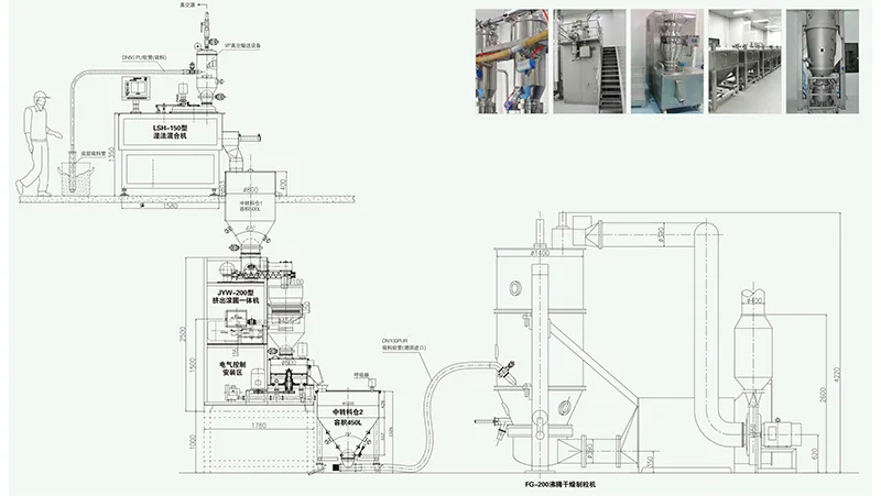 Formulation production line: wet mixer–extrusion spheronizer–fluid bed–screening–filling